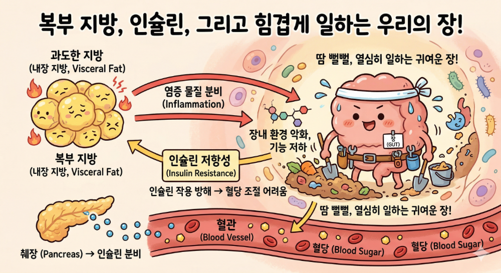 “살이 찌는 것은 의지의 문제가 아니라 호르몬의 명령입니다.” 과도한 인슐린은 우리 몸을 ‘지방 연소 모드’에서 **’지방 저장 모드’**로 강제 전환시킵니다. 쓰고 남은 에너지는 인슐린의 손에 끌려 복부 지방으로 차곡차곡 쌓이게 됩니다. (출처: 코메디닷컴 – 과당과 인슐린 분비가 체중 증가에 미치는 영향)